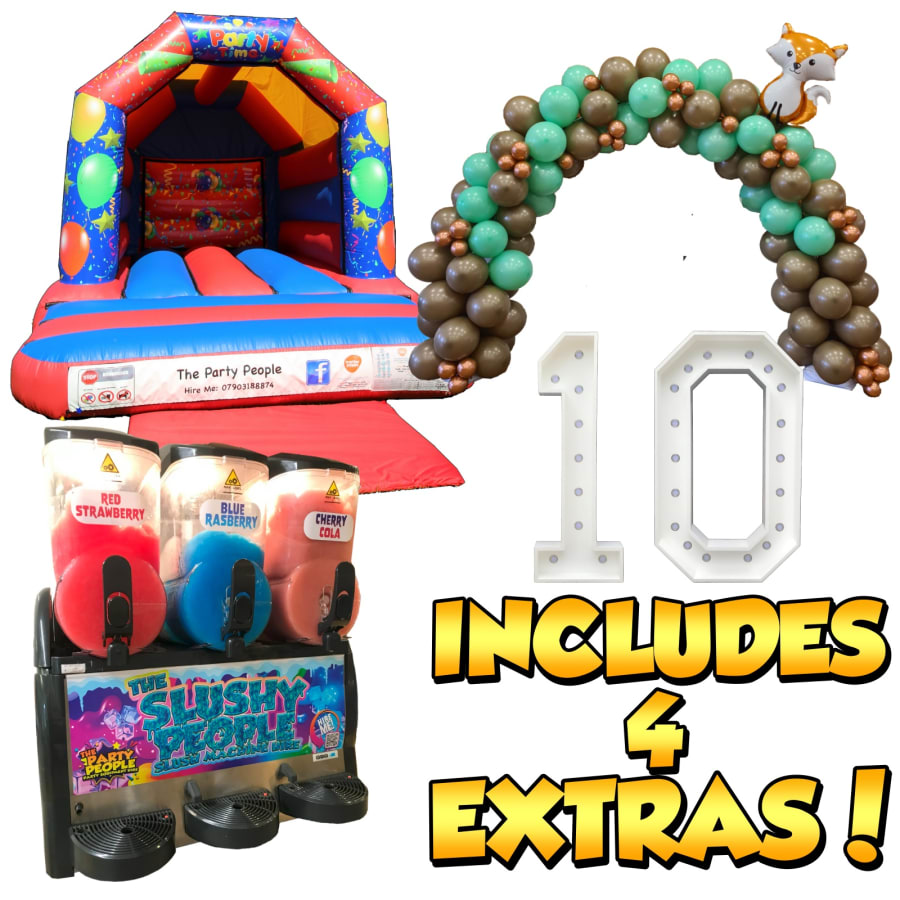 Make your party extra sweet with our Full Slush Package! Combining a large bouncy castle, a balloon arch or full circle, our Triple 12L Slush Machine, two Number Lights, and four fun extras, this package delivers hours of entertainment and delicious frozen treats for children and teens alike.