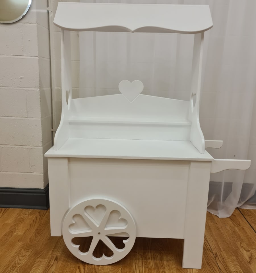 Add charm and versatility to your event with our handmade white wooden Reception Cart – perfect for presents, guest books, seating plans, or a welcome table.