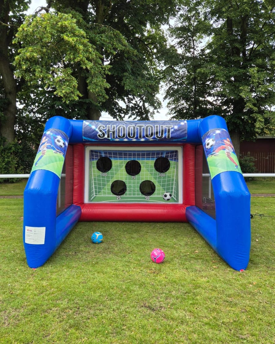 Test your football skills with our red and blue Inflatable Penalty Shootout! Standing at 10ft tall and measuring 11x11ft, this interactive game challenges players to aim for 5 target holes, racking up a score of up to 350 points. Perfect for football fans of all ages, it’s a guaranteed crowd-pleaser at parties, school events, fun days, and sports-themed celebrations